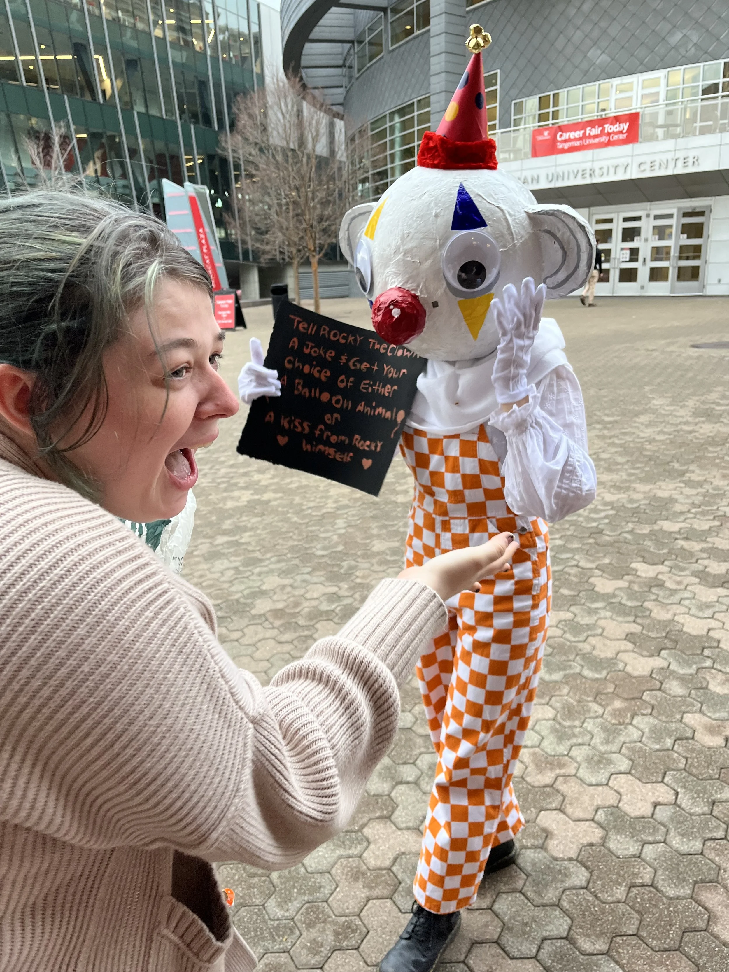 Rocky The Clown is a mascot filled with rocks and nothingness. Tell him a joke and you have the choice of receiving a balloon animal, or receiving a gentle kiss on the cheek from Rocky himself. He is just a boy trying to spread cheer!